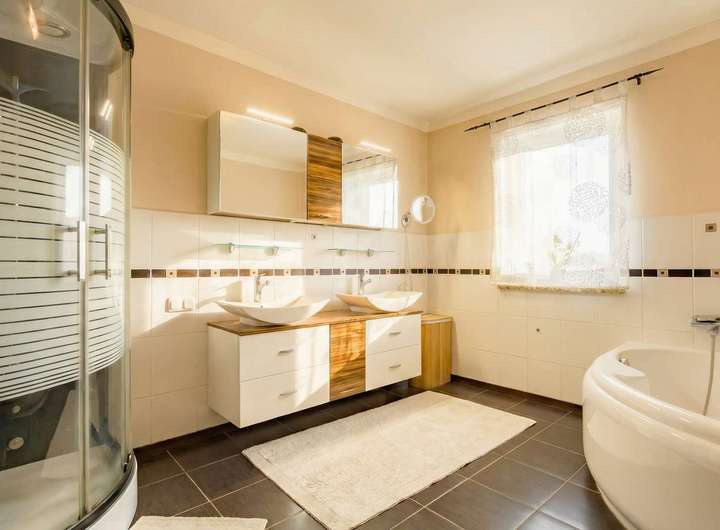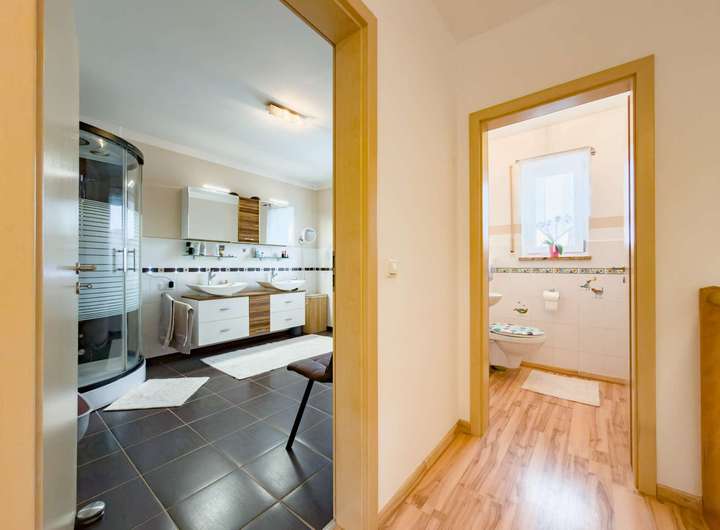 - Tageslicht Bad mit XXL-Dusche inkl. Massagefunktion und Beleuchtung, Doppelwaschtisch, Eckbadewanne und Handtuchheizkörper
