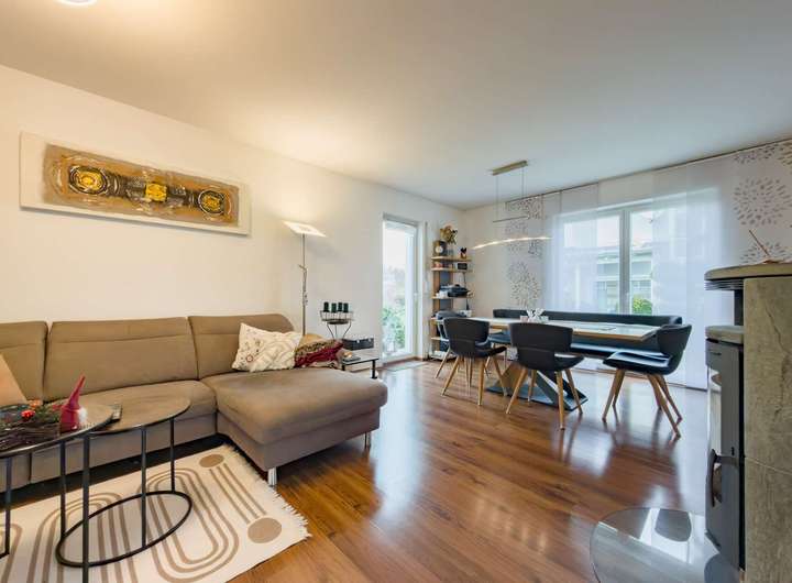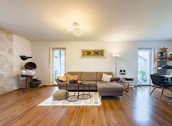 - Zugang vom Wohnzimmer aus auf die Süd-West-Terrasse (inkl. Loungemöbeln und Infrarotlampe)