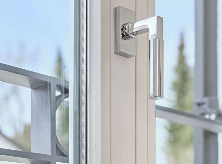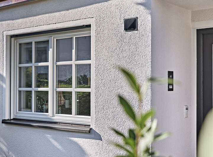 - Klassische, weiß lackierte Meranti-Holz-Sprossenfenster mit energieeffizienter 3-Scheiben-Verglasung und elektrisch bedienbaren Aluminium-Rolläden