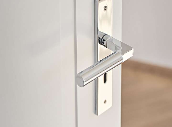 - Weißlack-Innentüren mit Kasten-Fräsung und hochwertigen Beschlägen im zeitlosen Bauhaus-Stil