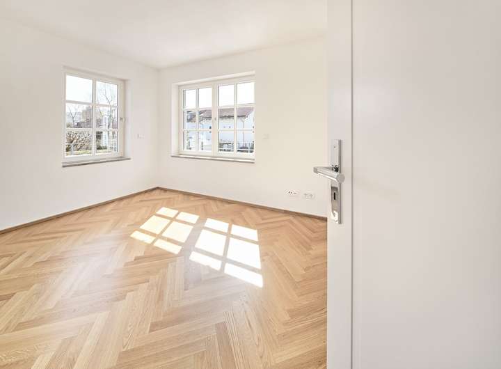 - Klassischer Echtholz Fischgrät-Eichen-Parkett mit geölter Oberfläche in allen Wohn- und Schlafräumen