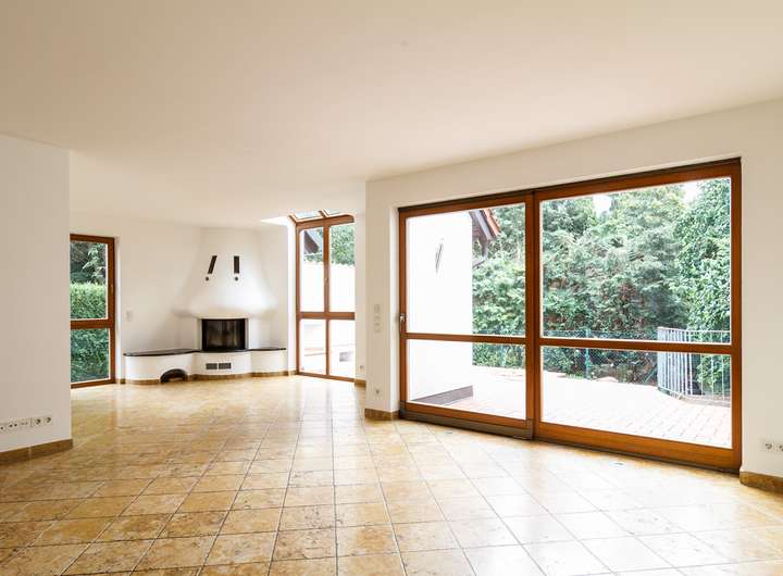 der Terrasse mit Außenkamin blickt man ins Grüne. Im Garten vor