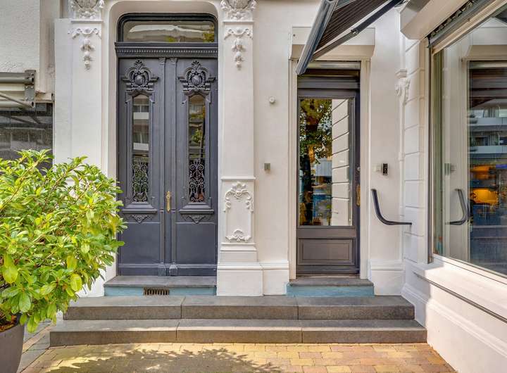 Das Vorderhaus fügt sich harmonisch ein und setzt eigene Akzente. Die ca. 96 m² große Gewerbeeinheit im Erdgeschoss dient derzeit als Atelier und Showroom – hohe Decken, Lichtfülle und originaler Stuck schaffen Räume, in denen Ideen wachsen dürfen. Eine Küche, ein Duschbad und der Zugang zum Innenhof vervollständigen die Funktionalität.