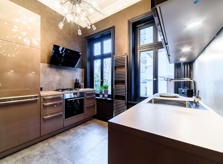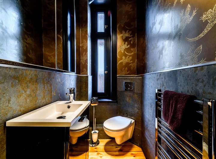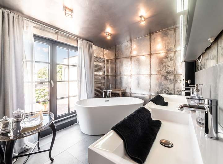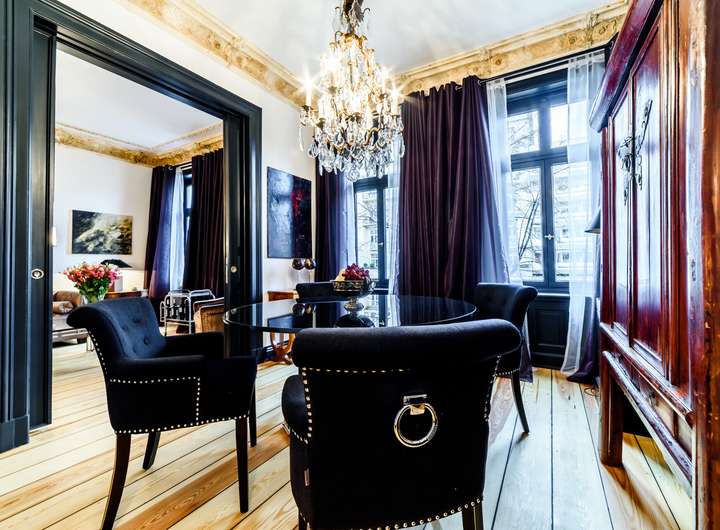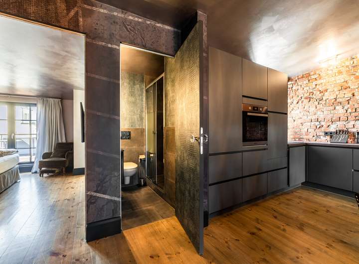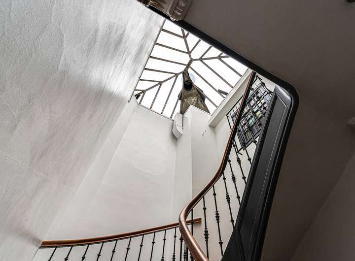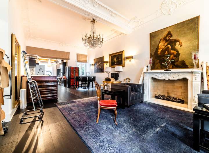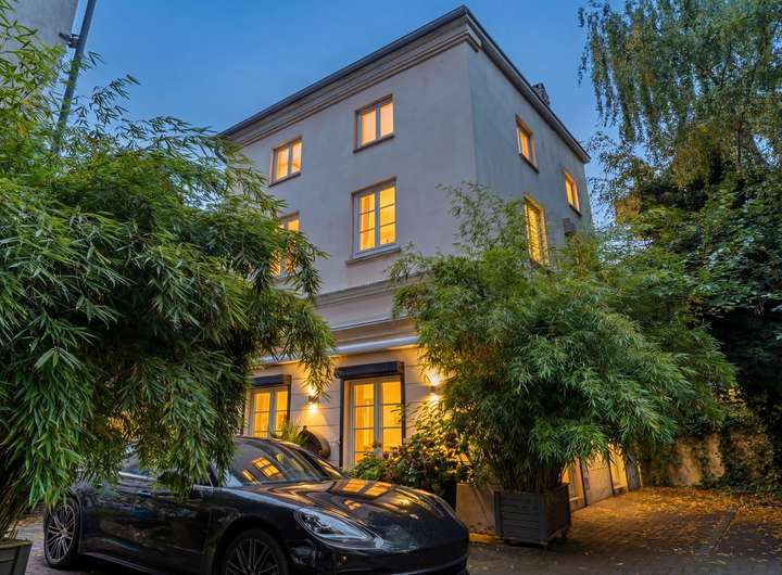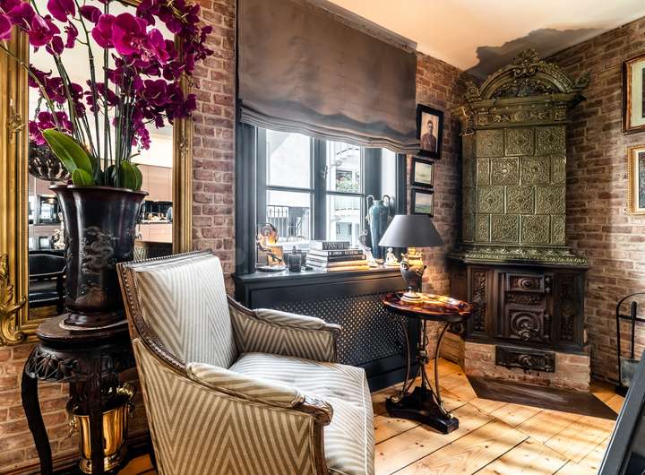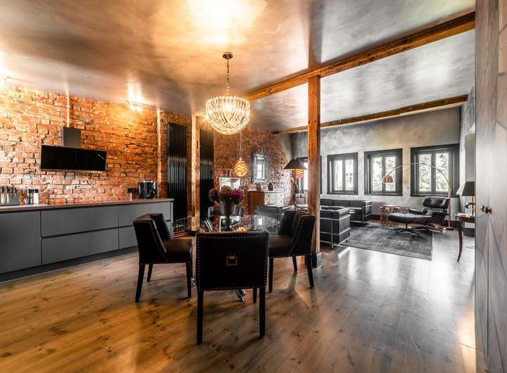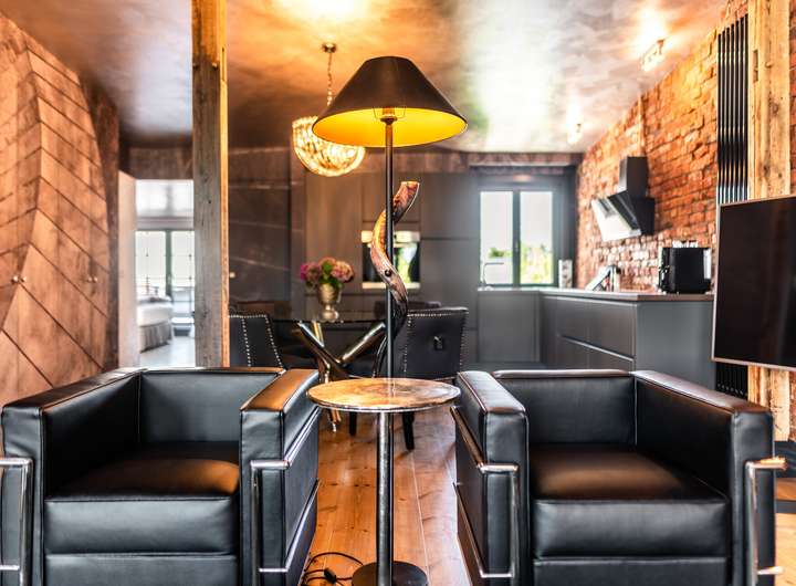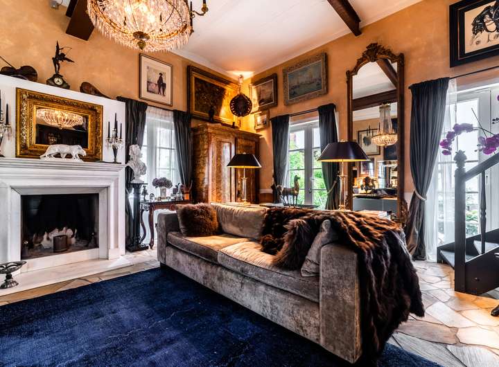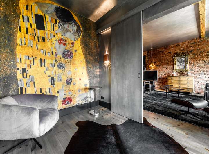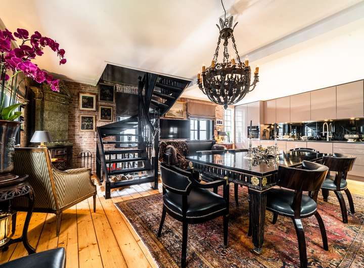Über drei Etagen verbindet es klassische Eleganz, industrielle Akzente und künstlerische Freiheit. Dunkle Töne treffen auf Holz, Ziegel und Metall, während glänzende Oberflächen feine Highlights setzen. Im Erdgeschoss lädt ein großzügiges Studio mit offenem Kamin und Natursteinboden zum Ankommen und Durchatmen ein; die mediterrane Terrasse wirkt wie ein kurzer Urlaub im Süden.