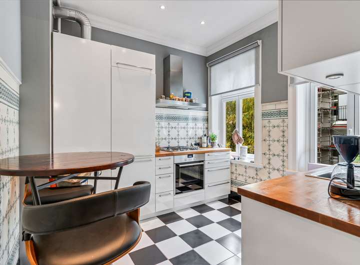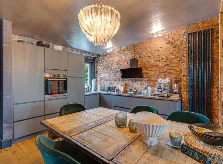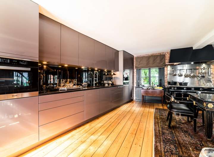 Im ersten Obergeschoss bildet die offen gestaltete Wohnküche das Herz des Hauses. Schiffsböden, sichtbare Ziegelwände und eine beeindruckende La-Cornue-Gaskochstelle schaffen eine Bühne für Kochkultur und Genuss. Eine hochwertige Küche mit Miele-Geräten sowie ein Kachel-Grundofen runden das Ambiente ab.