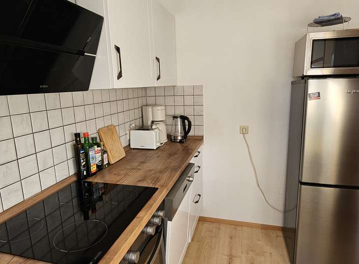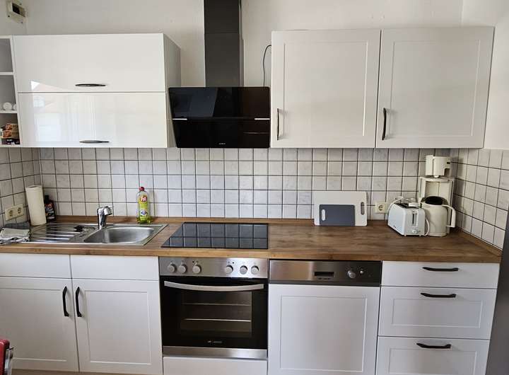 Die moderne Einbauküche ist komplett ausgestattet und verfügt über einen Keramikherd, Backofen und eine Spülmaschine.