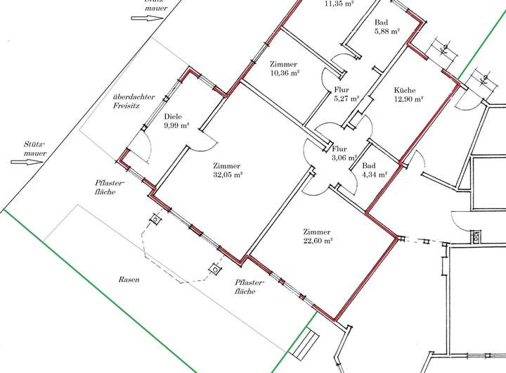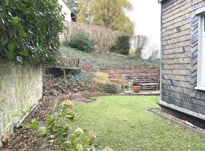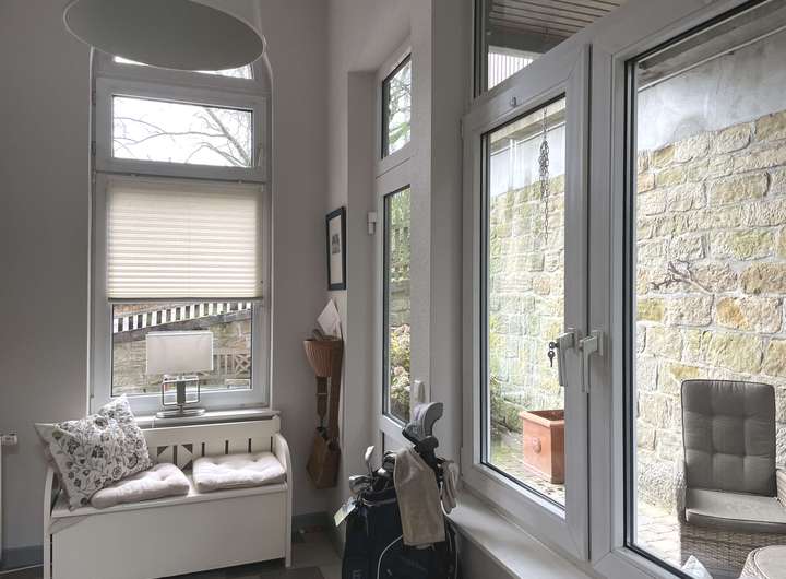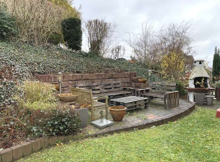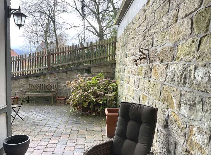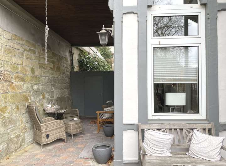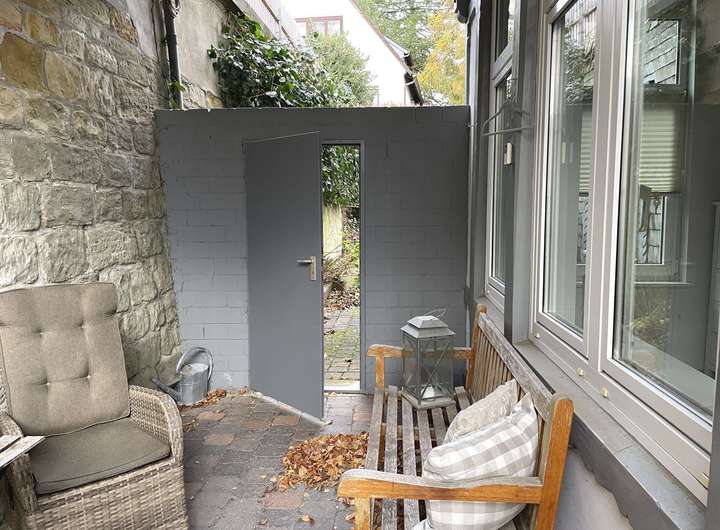 Der Weg zu dieser Wohnung (WE 1, EG) führt bequem über einen gepflasterten Weg mit vier Steinstufen vorbei am kleinen Vorgarten, der sich auf der Südseite des Hauses erstreckt. Ein sehr gemütlicher, überdachter Sitzbereich, der aufgrund einer rustikalen Steinmauer beinahe einen „Burgcharakter“ aufweist, schützt den privaten Wohnungseingang vor Witterungseinflüssen. Sowohl der Vorgarten (ca. 70 m²) als auch der größere Außenbereich (ca. 100 m²) hinter dem Gebäude ist dieser Wohnung zur alleinigen Nutzung zugeordnet.