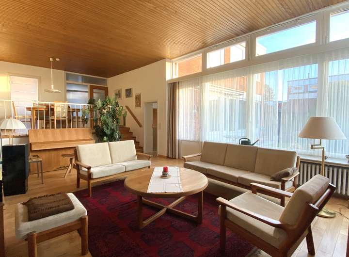 Über wenige Stufen abwärts gelangt man in das beeindruckende Wohnzimmer, das durch seine großzügige Fensterfront zur Gartenseite begeistert.