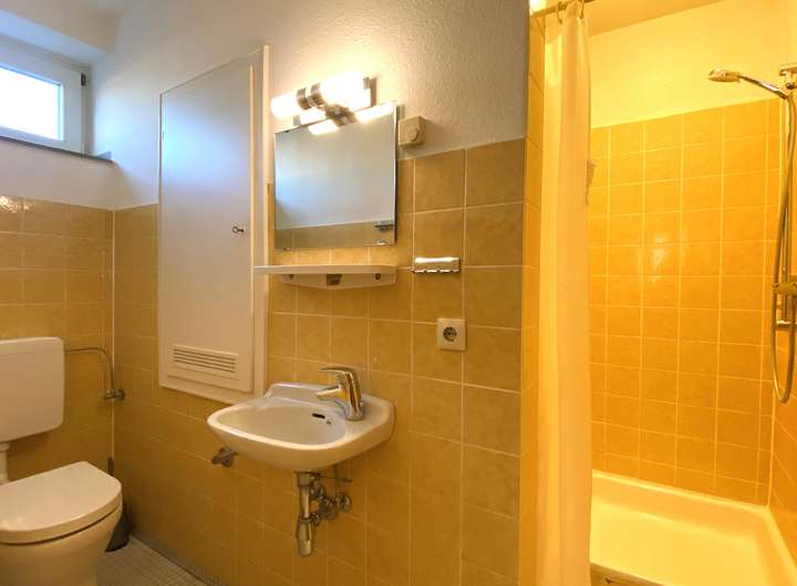 Das Obergeschoss bietet insgesamt drei Räume. Ein ehemaliges Badezimmer wurde 2024 modernisiert und bewegungsfrei nur noch mit Waschbecken ausgestattet. Direkt nebenan liegt das Badezimmer mit Dusche.