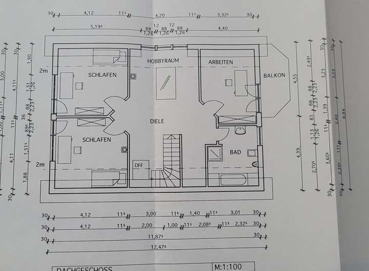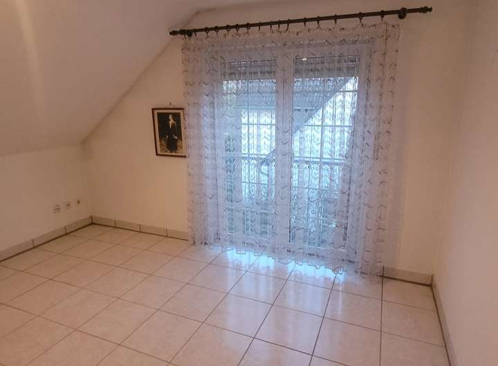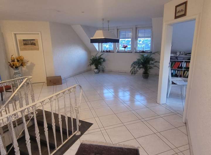 Im 2. OG: 3 Zimmer, Bad, ca. 32 m² große Diele, Fliesenböden, ca. 8 m² großer Balkon, geeignet als Kinder-, Büro- oder Gästezimmer.