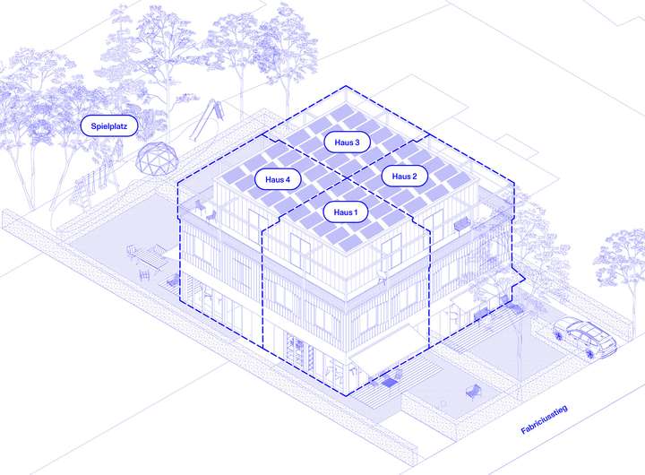 Der quadratische Baukörper ist in vier eigenständige Eckhäuser gegliedert. So entsteht ein Bautypus, der das Verhältnis von Gemeinschaft und Privatheit ausbalanciert: Jede Partei hat ihre eigene Ecke (mit eigenem Gartenstück) – mit klarer Adresse und hoher Rückzugsmöglichkeit – und zugleich einen Bezug zur gemeinschaftlichen Mitte.