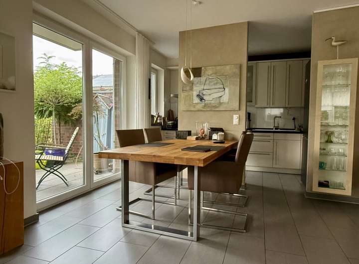 Der Wohn- und Essbereich ist hell gestaltet und ermöglicht den Zugang zur teilüberdachten Terrasse sowie zum daran anschließenden Garten. Dieser ist durch eine etwa zwei Meter hohe Kirschlorbeerhecke eingefasst.