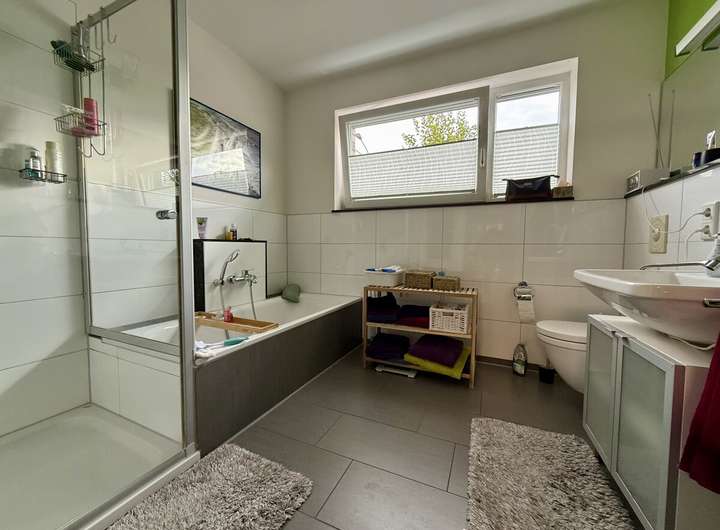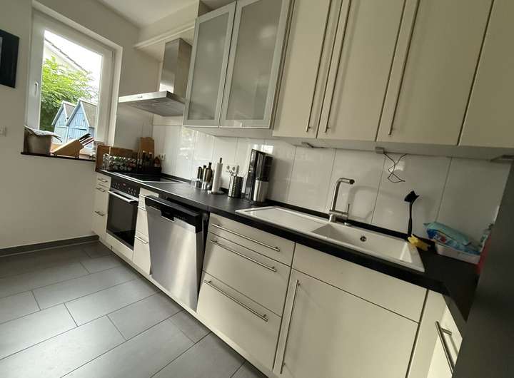 Zwei Schlafzimmer, ein Badezimmer mit Wanne und Dusche, ein Gäste WC, eine Küche, eine Diele und ein Hauswirtschaftsraum gehören ebenfalls zur Wohnung. Die Waschmaschine kann im Keller oder im eigenen Hauswirtschaftsraum untergebracht werden.