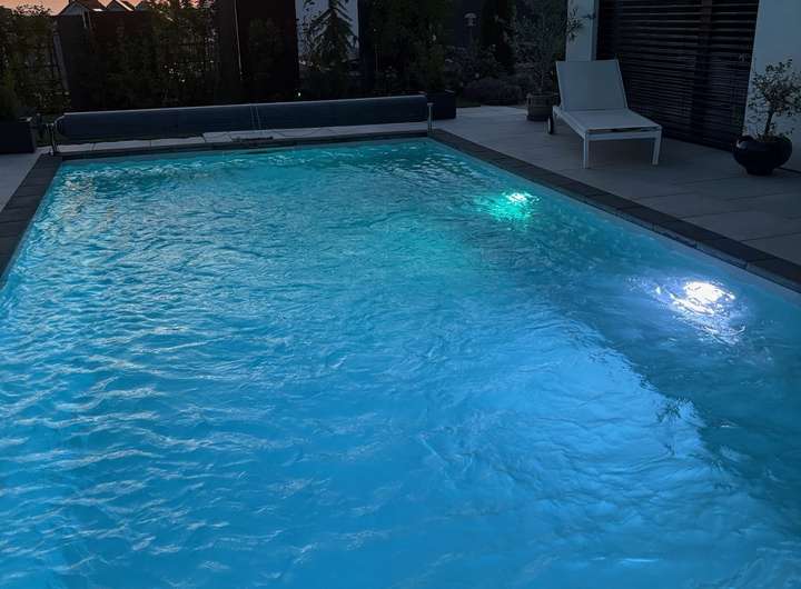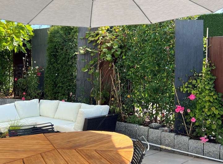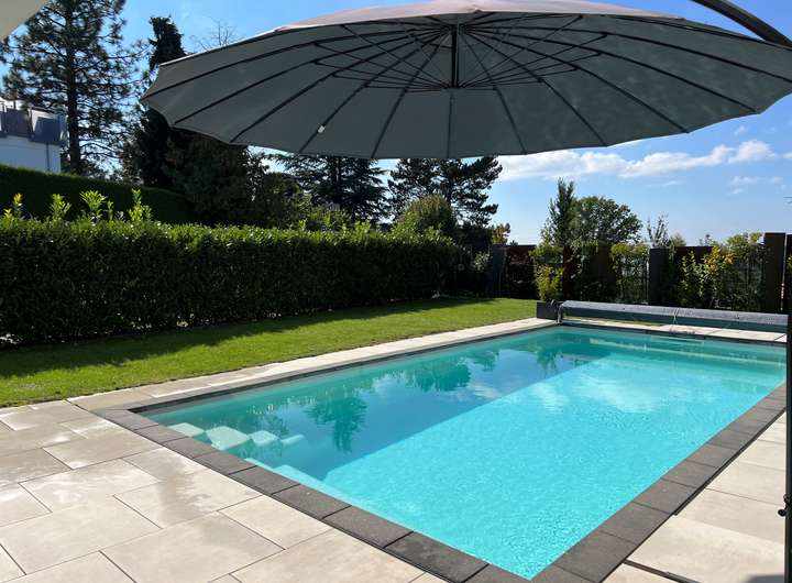 In dem schön angelegten Garten bildet ein beheizter Pool den Mittelpunkt. Attraktiv gestaltete Sitzecken sowie eine Gartendusche mit Kalt- und Warmwasser runden das Angebot ab. Sowohl von den