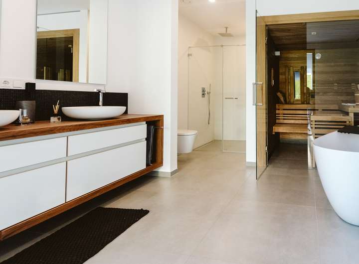 Ein besonderes Highlight: der exklusive Elternbereich mit Schlafzimmer, Ankleide und einem luxuriösen „en suite“-Bad inklusive integrierter Sauna – Ihre private Wellnessoase direkt im Haus.