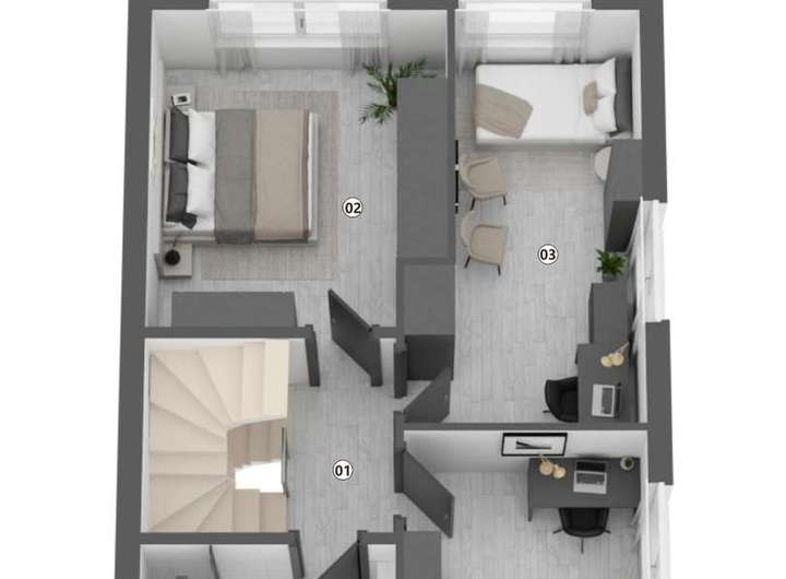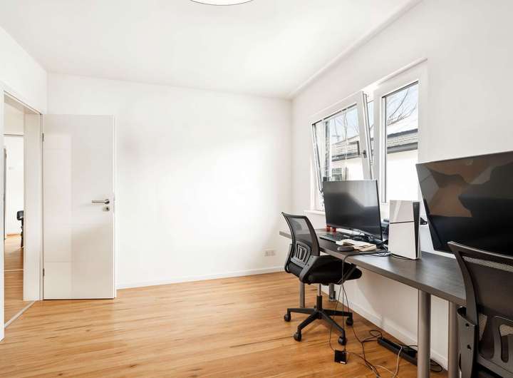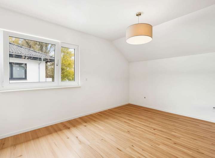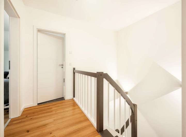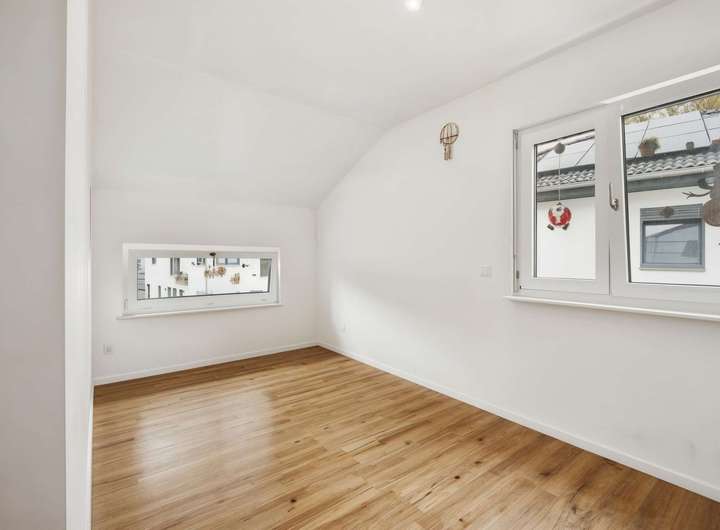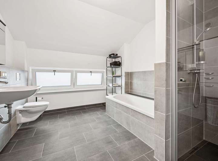 Im Obergeschoss setzt sich diese Atmosphäre fort. Drei großzügige Zimmer eröffnen vielfältige Nutzungsmöglichkeiten – als Schlafzimmer, Home-Office, Kinderzimmer oder kreativer Rückzugsort. Das stilvolle Badezimmer mit ebenerdiger Dusche und Badewanne wurde mit viel Liebe zum Detail gestaltet und verwandelt den täglichen Ablauf in einen Moment des Wohlfühlens. Über eine unauffällig integrierte Zugangslösung erreicht man zudem den Spitzboden, der dank seiner Fläche wertvollen zusätzlichen Stauraum schafft.