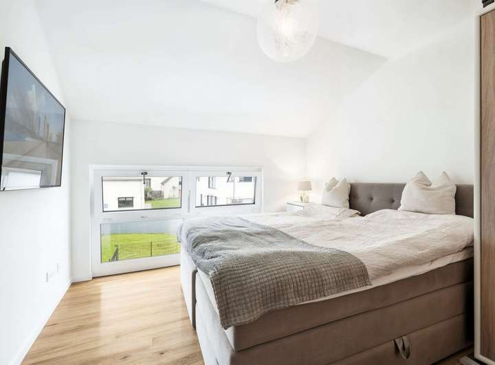 Eine energieeffiziente Luftwärmepumpe mit Fußbodenheizung sorgt für ein behagliches Raumklima, dreifach verglaste Fenster bieten hervorragenden Wärme- und Schallschutz, und elektrisch betriebene Rollläden erhöhen den Wohnkomfort. Besonders hervorzuheben ist die Lüftungsanlage mit Wärmerückgewinnung, die nicht nur zuverlässig vor Feuchtigkeit schützt, sondern gleichzeitig für ein gesundes, ausgeglichenes Raumklima und Energieeinsparungen sorgt.