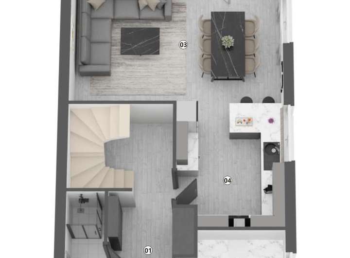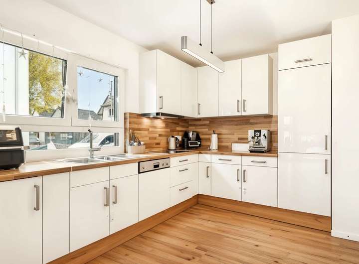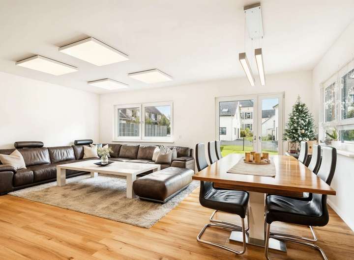 Der Wohn-, Ess- und Küchenbereich bildet das Herzstück des Hauses. Offen gestaltet, großzügig proportioniert und von Tageslicht durchflutet, entsteht hier ein Raum, der Geselligkeit und Wohlgefühl perfekt miteinander verbindet. Ob entspannte Familienabende, gemeinsames Kochen oder gesellige Runden – dieser Bereich erfüllt höchste Ansprüche an modernes Wohnen. Die direkte Verbindung zur Terrasse und dem Garten erweitert den Lebensraum nahtlos in die Natur und schafft ein wunderbares Gefühl von Freiheit.