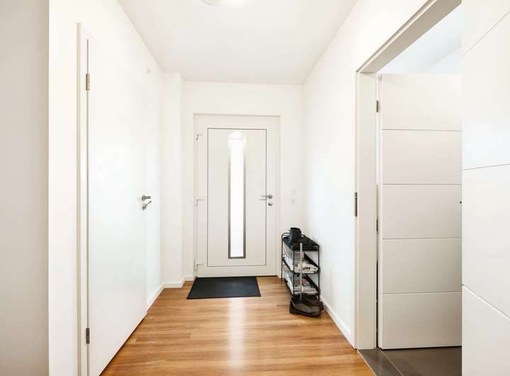 Schon beim Eintreten spürt man die harmonische Architektur des Hauses. Ein freundlicher Eingangsbereich heißt Bewohner wie Gäste willkommen und führt fließend in die hellen Wohnräume. Der Hauswirtschaftsraum bietet wertvollen Stauraum und Platz für sämtliche Haustechnik, während ein elegant gestaltetes Gäste-WC mit zusätzlicher Dusche schon im Erdgeschoss einen besonderen Komfort bietet.