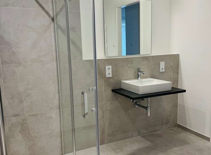 An das Wohn-/Esszimmer angrenzend befindet sich das modern gestaltete und ebenfalls sehr geräumige Bad mit vorinstallierten Beleuchtung und Spiegel sowie einem Handtuchheizkörper. Die selbstverständlich barrierefrei zugängliche Dusche (1,20 x 1,20m) ist zudem bereits mit einer hochwertigen Glasduschabtrennung versehen.