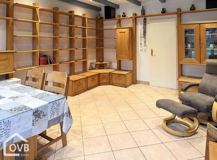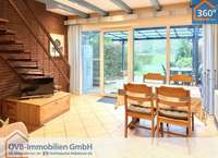 Das Haus bietet auf zwei Etagen eine angenehme Raumaufteilung. Im Erdgeschoss befindet sich ein heller Wohn- und Essbereich mit Kaminofen mit direktem Zugang auf die Terrasse. Von dort hat man einen schönen Blick auf den angrenzenden Springplatz.