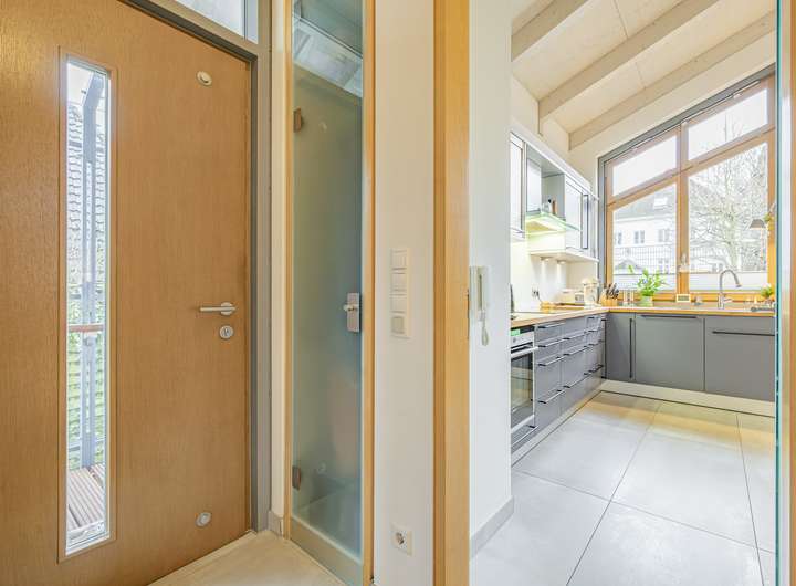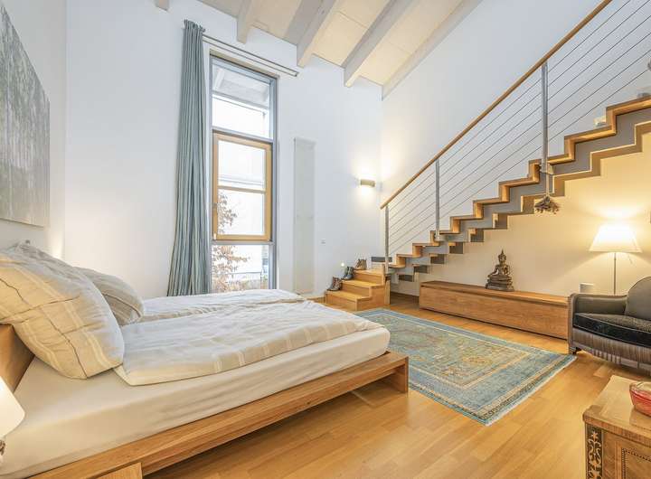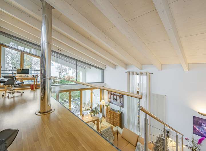 - Zentrale Wohnzone geprägt von Naturmaterialien, Eichenparkett, Fußbodenheizung, großen Glasfronten, integrierter Loggia und Galerie