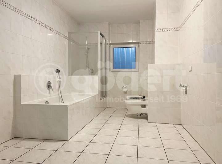 - Badezimmer mit Dusche, Badewanne, Waschbecken mit Ablage u. Spiegelschrank, Handtuchheizkörper, Bidet sowie WC
