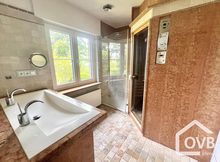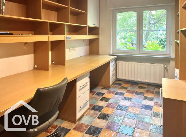 Ein stilvolles Schlafzimmer, ein ruhiges Büro sowie ein edles Badezimmer mit Infrarotsauna und Regendusche lassen keine Wünsche offen. Eine separate Gästetoilette sowie ein praktischer Hauswirtschaftsraum mit direktem Zugang zum Nebengebäude runden das Raumangebot im Erdgeschoss ab.