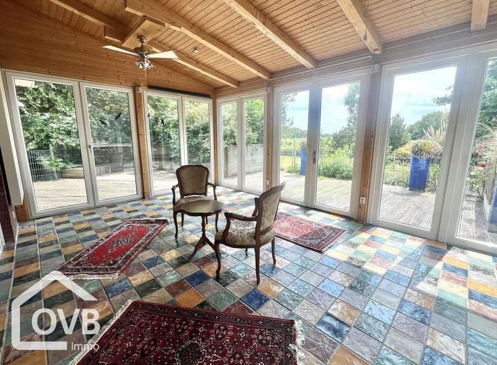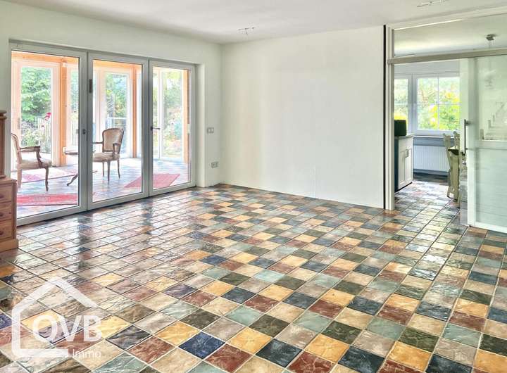 Das Herzstück des Hauses bildet das großzügige Wohnzimmer, das mit seinem offenen Schnitt und dem direkten Übergang in den behaglichen Wintergarten zum Verweilen einlädt. Große Fensterflächen sorgen für lichtdurchflutete Räume und verbinden Innen und Außen auf harmonische Weise. Die hochwertige italienische Bodenfliese, die sich durch das gesamte Erdgeschoss zieht, unterstreicht den eleganten Charakter des Hauses.