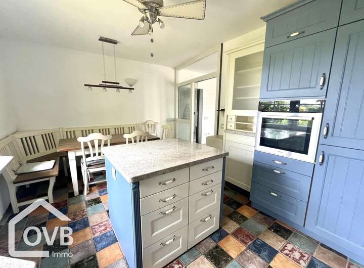 Die angrenzende Küche ist nicht nur funktional, sondern auch ein Ort für ein geselliges Miteinander: Ausgestattet mit modernen Geräten und einer gemütlichen Sitzecke fügt sie sich perfekt in das offene Wohnkonzept ein.