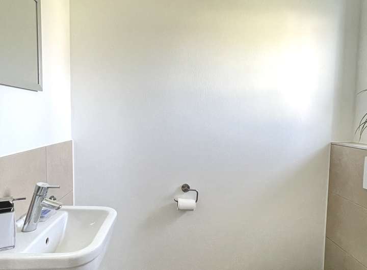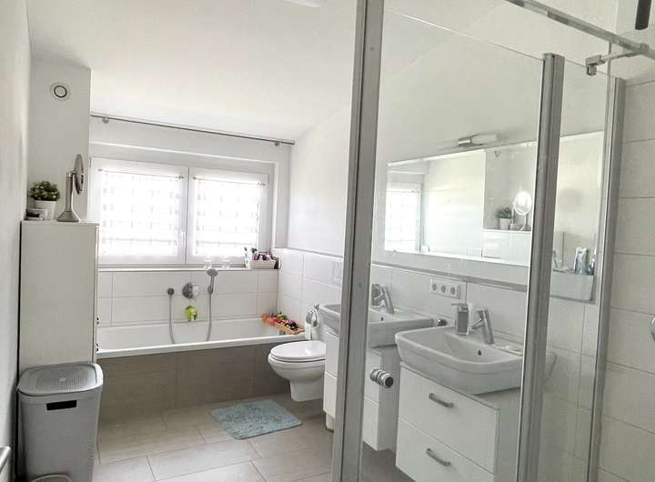 Das Badezimmer ist hochwertig ausgestattet und bringt mit Badewanne, großer Dusche, zwei Waschbecken. einem WC und Tageslichtfenster, sowie Belüftungsanlage (im gesamten Haus) alles mit, was man braucht. Natürlich gibt es auch ein zusätzliches Gäste-WC im Erdgeschoss.