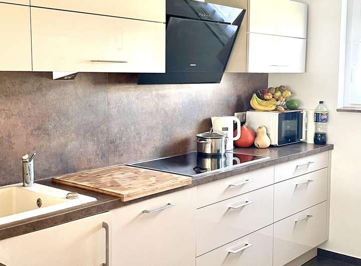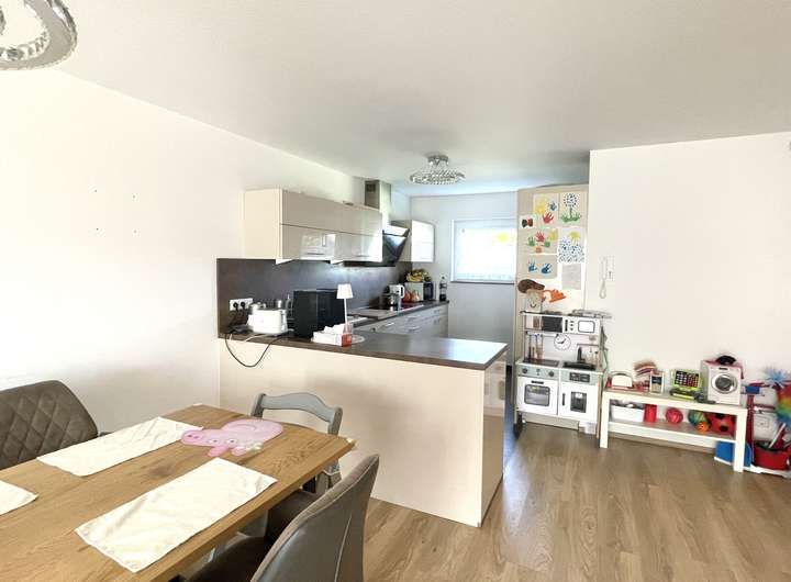 Angekommen im großen Wohnbereich findet man sich in einem offenen Raumkonzept wieder. Durch die bodentiefen Fenster und dem Terrassenausgang fällt viel Tageslicht ins Wohnzimmer. Die Aufteilung der einzelnen Bereiche ist problemlos zu erkennen und macht den Alltag einfach. Die schöne Küche ist mit ihrem sanften Farbtönen ein gelungenes Element um die hochwertige Ausstattung widerzuspiegeln.