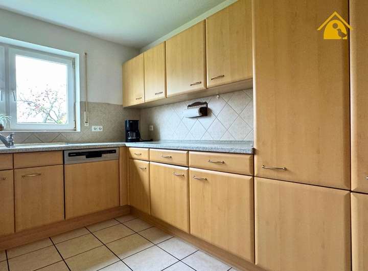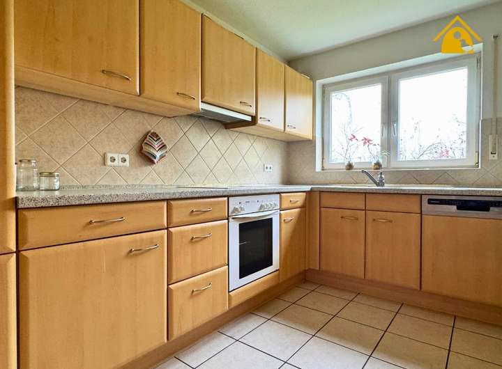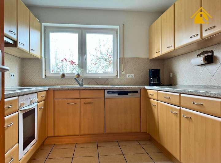 • Separate Küche mit U-förmiger Einbauküche, hellen Holzfronten und dunkler Arbeitsplatte. Ausgestattet mit Spülmaschine, Herd, Backofen, Spüle sowie einem Fenster.