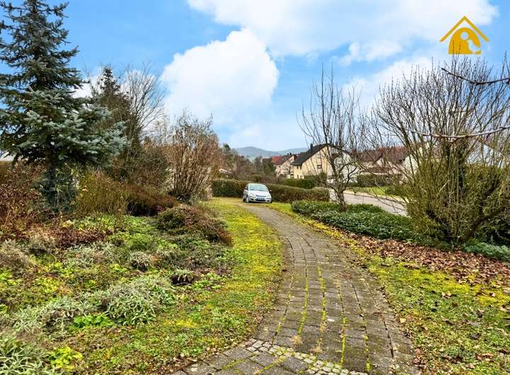 • Der dazugehörige große Garten ist parkähnlich angelegt, mit Rasenflächen, Sträuchern, Bäumen und einem gepflasterten Weg, der zur Garage führt.
