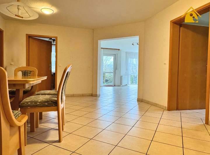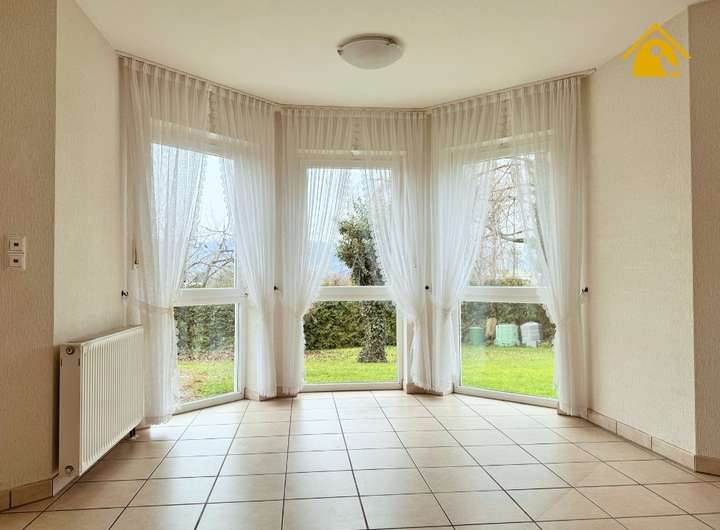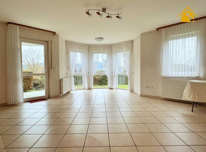 • Der großzügige Wohnraum überzeugt durch seine helle Gestaltung, die halbrunde Fensterfront (Erker) sowie den direkten Zugang zur Terrasse und in den Garten. Große helle Fliesen unterstreichen die freundliche Atmosphäre. Der offene Essbereich ist ein Übergang zwischen Wohnzimmer und den restlichen Räumen.