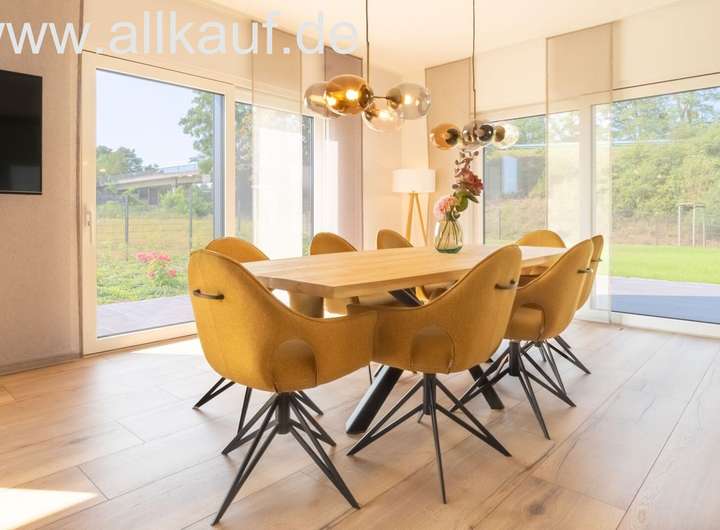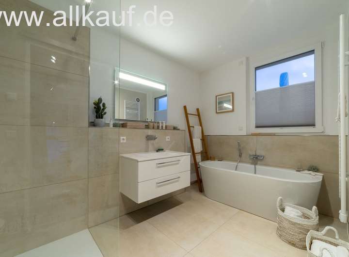 Das Haus bietet eine gehobene Ausstattung mit hochwertigen Bodenbelägen aus Fliesen und Laminat. Diese Materialien sind nicht nur zeitlos und elegant, sondern auch pflegeleicht und langlebig. Die moderne Wärmepumpe sorgt für eine effiziente und umweltfreundliche Beheizung, während das Niedrigenergie- und KFW55-Energiekonzept die Betriebskosten minimiert und den Wohnkomfort maximiert.