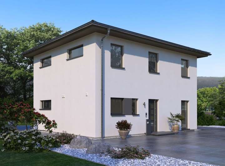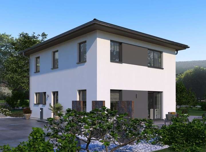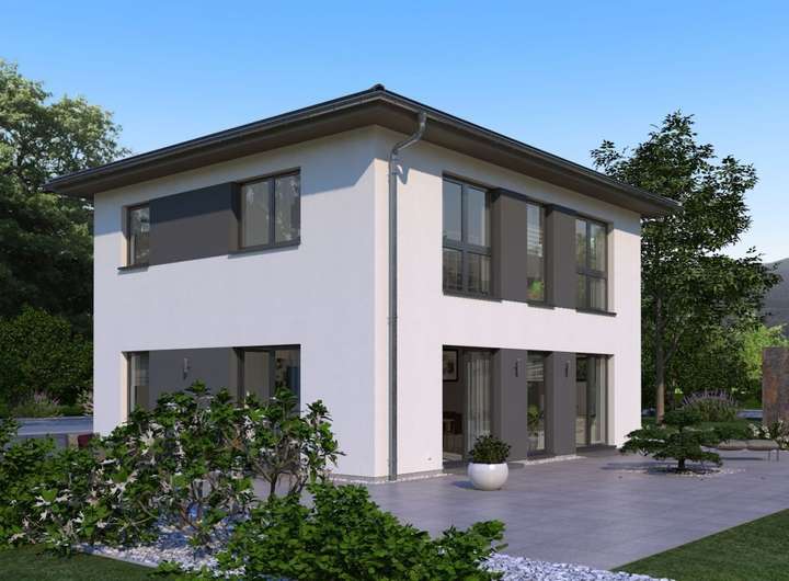 Ein Walmdach, das verkörpert Eleganz und vermittelt einen edlen, fast schon herrschaftlichen Eindruck. So auch bei unserer Stadtvilla 10 mit Walmdach. Das große Plus: Dank dieser Dachform gibt es im Obergeschoss keine Dachschrägen und damit zahlreiche Möglichkeiten zum Positionieren der Möbel. Doch diese Stadtvilla kann noch mit vielen weiteren kleinen und großen Ausstattungs- und Grundrissdetails punkten. So gibt es im ca. 78 Quadratmeter großen Erdgeschoss eine räumliche Zweiteilung: die Zimmer zum Entspannen und Zusammenkommen auf der Gartenseite, die funktionellen Räume auf der, der Straße zugewandten, Seite. Konkret bedeutet das: vom großen Wohn-Ess-Koch-Bereich ist der direkte Zugang auf die Terrasse und damit ins Grüne möglich. Büro, Hauswirtschaftsraum sowie Gäste-WC sind unterdessen gegenüberliegend und unmittelbar aus der Diele zugänglich. Im Obergeschoss befinden sich neben dem Reich der Eltern zwei identisch große Kinderzimmer sowie ein geräumiges Bad mit Wanne, Dusche und WC.