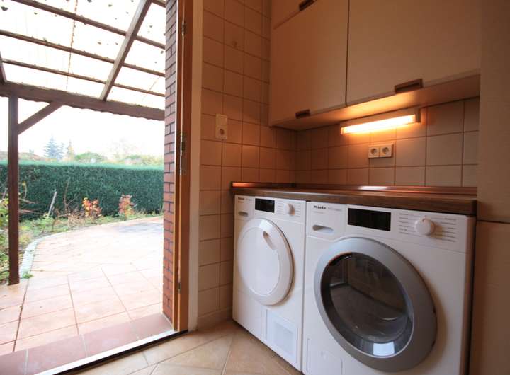 Im Erdgeschoss erwartet Sie ein großzügiger Wohn- und Essbereich, der durch seine offene Gestaltung ein helles und einladendes Ambiente schafft. Die separate Küche ist mit gepflegten Holzeinbauküche ausgestattet. Ein gut dimensionierter Hauswirtschaftsraum bietet wertvollen Stauraum und verfügt über einen direkten Zugang nach draußen, zur überdachten Terrasse, die zum Entspannen und Verweilen einlädt. Darüber hinaus verfügt das Haus über zwei weitere Terrassen, von denen eine mit einer ausfahrbaren Markise ausgestattet ist – ideal für sonnige Tage und flexible Nutzungsmöglichkeiten des Außenbereichs. Ein Gäste-WC komplettiert das Erdgeschoss.