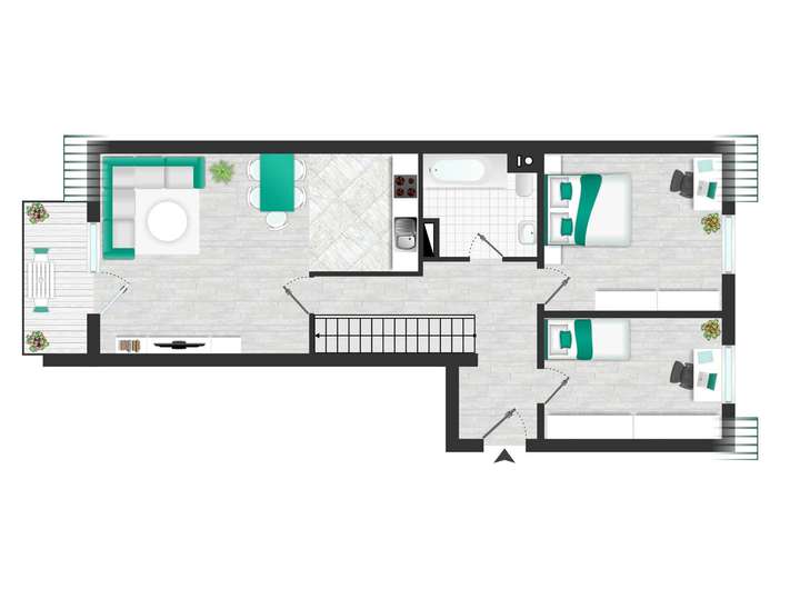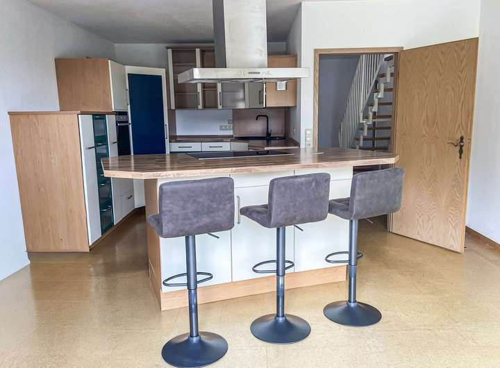 Im unteren Geschoss befindet sich ein einladender Flur, von dem aus sämtliche Räume bequem erreichbar sind. Mittelpunkt der Wohnung ist die lichtdurchflutete Wohnküche mit Einbauküche und Kochinsel. Von hier aus gelangen Sie direkt auf den sonnigen Balkon. Ergänzt wird die Etage durch ein großzügiges Schlafzimmer, ein weiteres Zimmer (ideal als Kinder-, Gäste- oder Arbeitszimmer) sowie ein innenliegendes Bad mit Badewanne und Waschmaschinenanschluss.