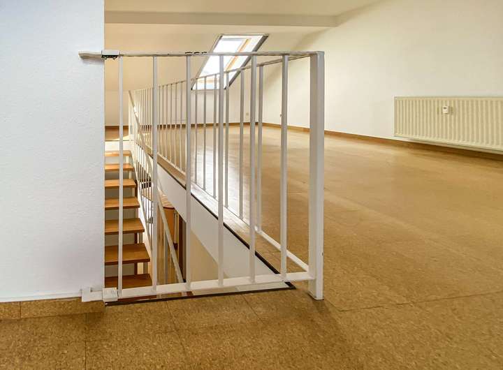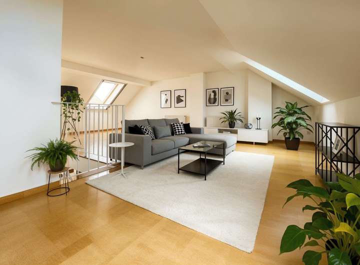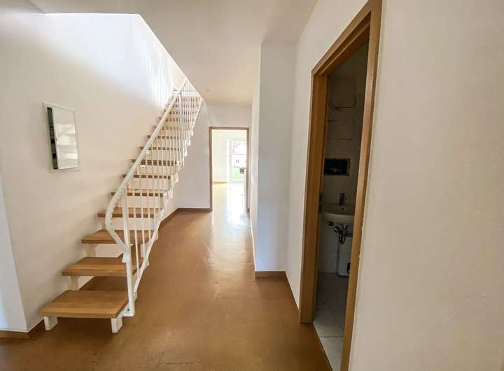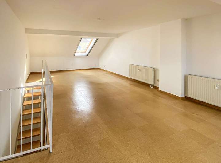 Über eine moderne Treppe erreichen Sie das obere Geschoss, das mit einem weitläufigen, offenen Wohn- und Arbeitsbereich überzeugt. Die offene Gestaltung schafft ein besonders wohnliches Ambiente und ermöglicht zahlreiche Nutzungskonzepte, egal ob Rückzugsort, Homeoffice oder zusätzlicher Wohnraum. Bei Bedarf kann dieser auch abgetrennt werden.