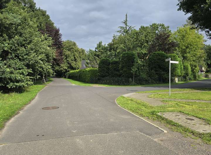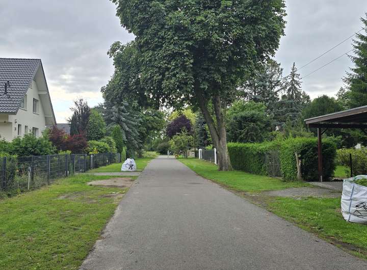 Das Grundstück befindet sich im Ortsteil Finkenkrug der Stadt Falkensee, Brandenburg. Finkenkrug ist bekannt für seine ruhige, grüne Wohnlage mit einer Mischung aus Einfamilienhäusern und kleineren Mehrfamilienhäusern. Die Straße selbst ist eine asphaltierte Wohnstraße mit einer Geschwindigkeitsbegrenzung von 30 km/h.