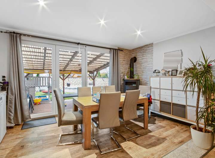 Im EG erwarten Sie ein modernisiertes Gäste-WC mit Fenster, eine geräumige Küche mit Einbauküche und das großzügige Wohn- und Esszimmer mit direktem Zugang zur Terrasse und in den Garten. Das Wohn- und Esszimmer wird durch den Kamin abgerundet.