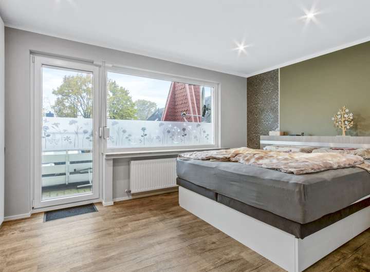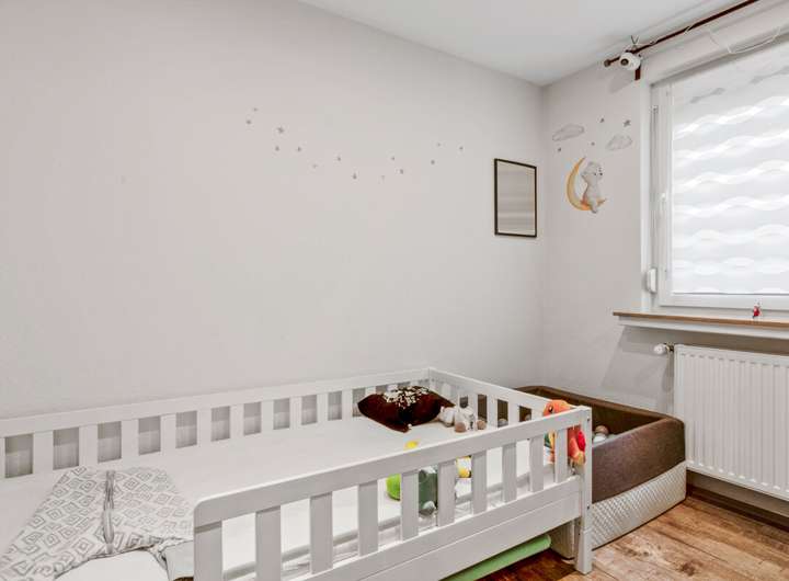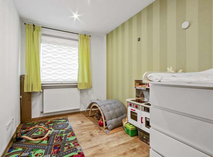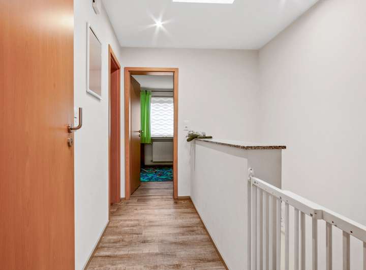 Das OG bietet ein helles Vollbad mit Fenster, ein Kinderzimmer sowie ein Büro und ein Schlafzimmer mit Zugang zum Balkon. Im Obergeschoss sind Außenrollläden in den Schlafräumen vorhanden.