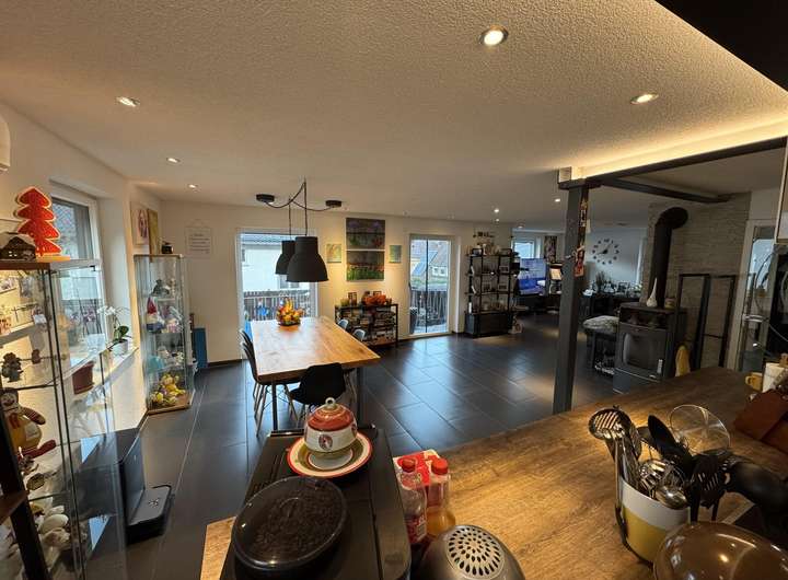Im Erdgeschoss erwartet Sie ein heller, offener Wohn- und Essbereich mit Küche, der das Herz des Hauses bildet. Hier spielt sich das Familienleben ab: gemeinsam kochen, quatschen und entspannte Abende verbringen. Der Holzkamin sorgt an kühleren Tagen für eine besonders angenehme Atmosphäre, während die Klimaanlage im Sommer für kühle Köpfe sorgt. Ein Gäste-WC rundet diese Ebene ab.