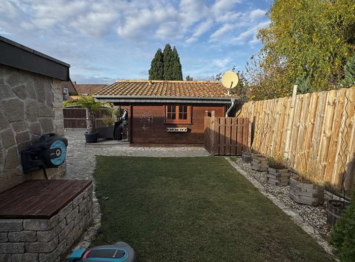 Großzügiger Garten mit Outdoor-Küche, Blockhaus, automatischer Bewässerung.