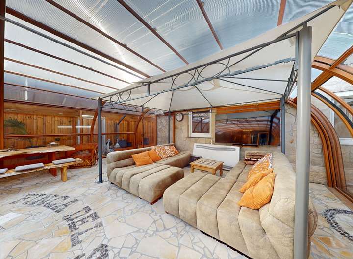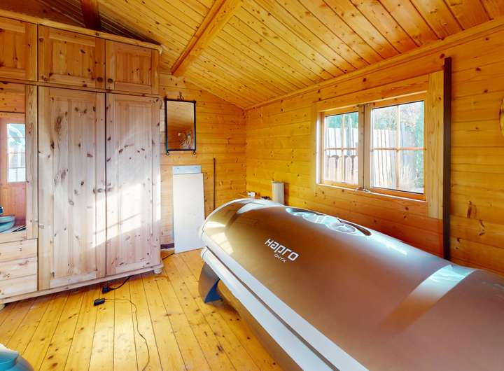 Ein besonderes Highlight ist der exklusive Wellness- und Freizeitbereich: Im Untergeschoss erwartet Sie eine großzügige Sauna mit Ruheraum, im Garten eine beeindruckende Poolanlage mit überdachter, weit zu öffnender Poolhalle. Die Outdoor-Küche, gemütliche Sitzbereiche und das Blockhaus schaffen weitere Rückzugsorte für entspannte Stunden im Freien.