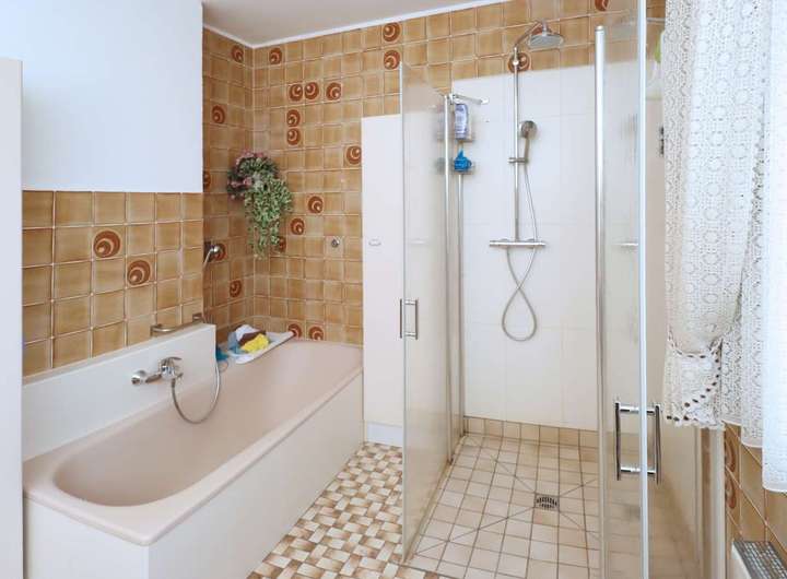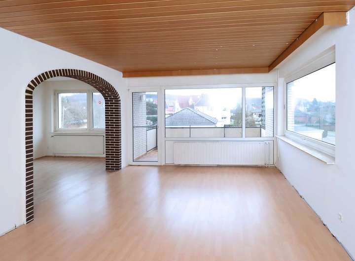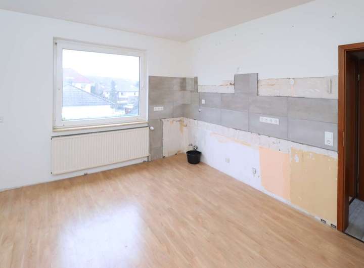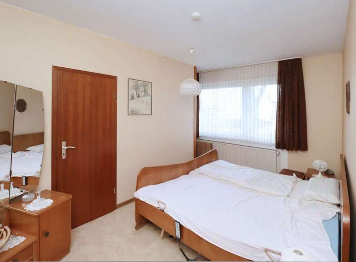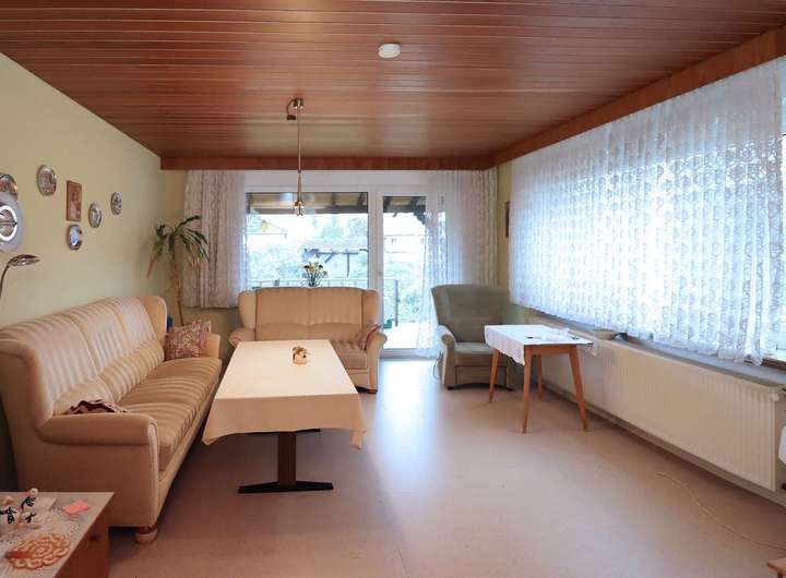 Die zweite Wohnung im Obergeschoss, mit einer Größe von ca.112,71 m² besteht aus einem Schlaf- und Kinderzimmer, Flur, Gäste-WC, teilmodernisiertes Tageslichtbad mit Walkin Dusche, Küche und dem offenem Wohn- und Essbereich. Aus dem Wohnzimmer gelangen Sie auf den Balkon mit herrlichem Blick auf den Garten.