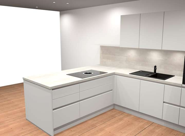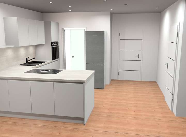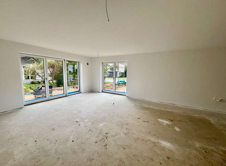 Der weitläufige Wohn- und Essbereich mit integrierter Küche bildet das Herzstück der unteren Ebene. Durch die große Fensterfront öffnet sich der Raum direkt zur Terrasse und in den Garten – ein idealer Bereich für Erholung und gesellige Momente. Ergänzend befinden sich hier eine Speisekammer, ein Gäste-WC, ein Abstellraum sowie ein funktionaler Hauswirtschaftsraum.
