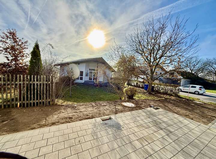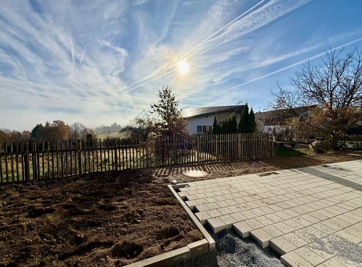 Die sonnige Terrasse und der Garten bieten angenehme Rückzugsmöglichkeiten im Freien. Zwei Carportstellplätze gehören ebenfalls zum Mietumfang.