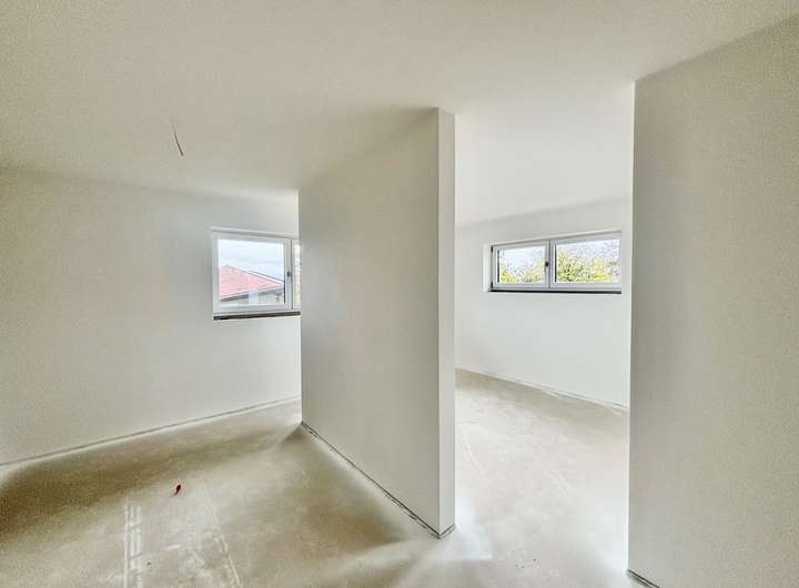 Im ersten Obergeschoss stehen ein geräumiges Schlafzimmer mit angrenzender Ankleide, ein Kinderzimmer, ein modernes Badezimmer, ein separates WC und ein weiterer Hauswirtschaftsraum zur Verfügung. Ein zentraler Flur verbindet die Räume und sorgt für eine klare Struktur.